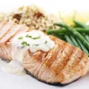 Malse zalmfilet geserveerd met een zachte saus, op smaak gebracht met witte wijn, knoflook en kruiden. De romige saus vult de volle smaak van de zalm mooi aan, wat het tot een gerecht maakt.