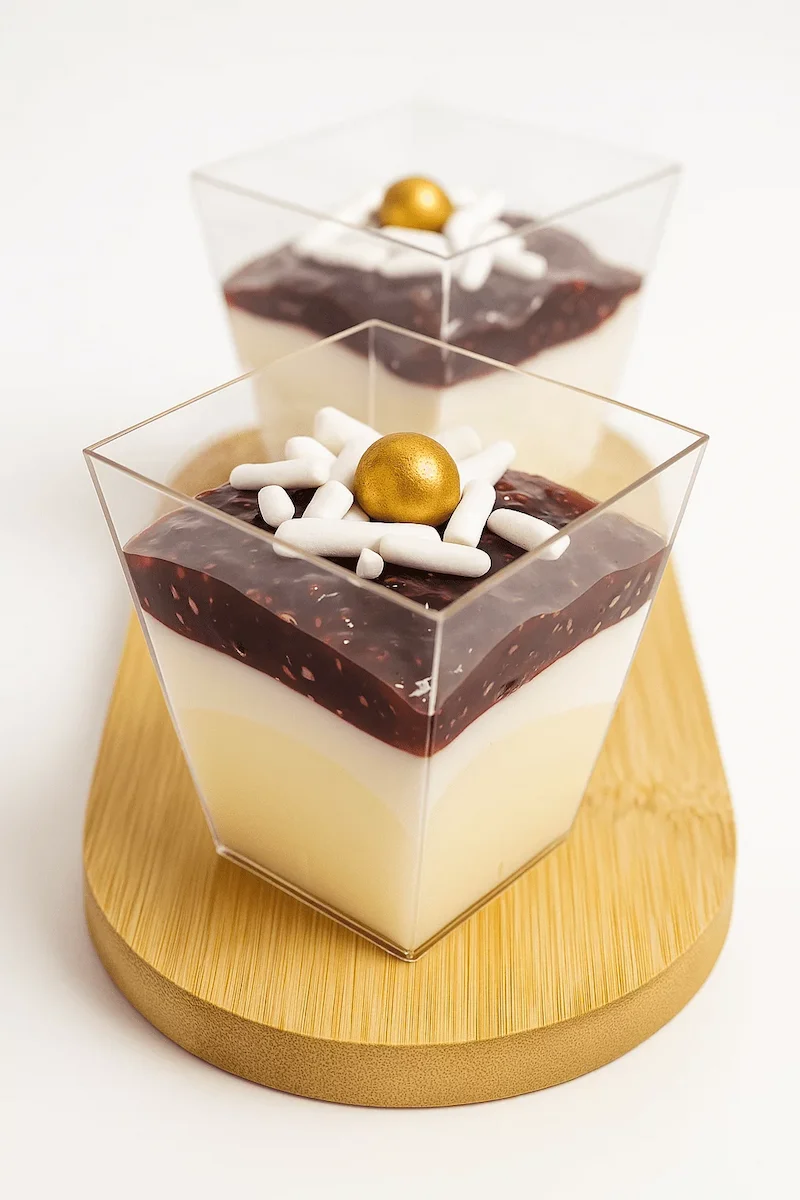 Een fluweelzachte vanille pannacotta, afgewerkt met een kleurrijke topping van bosvruchten voor een frisse en elegante bite.