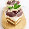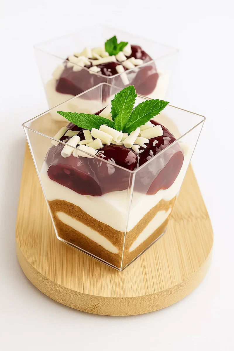 Romige monchou trifle op een knapperige crumblebodem, verrijkt met een zoete kersentopping en witte chocolade flakes voor een luxe mini-dessert.